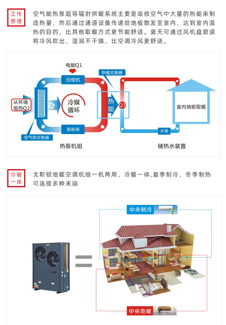 冬季供暖時,熱泵主機通過風機盤管快速加熱室溫,然后熱泵主機將熱水注入地暖盤管進行地暖。毫無疑問,地板采暖具有舒適、均勻、舒適、節能、清潔、無噪音、保健等優點。風控面板的智能切換使地板采暖更加舒適風機盤管與地板采暖形成完美結合。